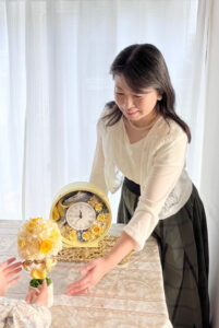 着物の帯や横浜スカーフなど、日本の伝統的な素材と花を組み合わせた作品づくりをしています。これまでに上野の森美術館や国立新美術館での発表、横浜高島屋や東武百貨店での販売も経験し、広島やスペインの国際平和美術展に出展してきました。