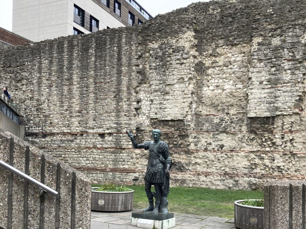 ロンドン・ウォールの前には、ローマ帝国の領土が最大だった時の皇帝トラヤヌス(在位98~117年)の像が立っています。これは1950年代に地元の再開発を記念したものです。