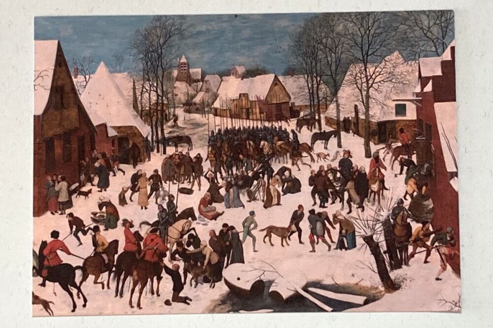 聖書の「幼児虐殺」は、イエスの誕生を聞いたヘロデ王がベツレヘムの2歳未満のすべての子供を殺すよう命じ、実行した場面です。17世紀初めに、幼児虐殺を隠すように、幼児を食べ物や動物に塗り替えました。1988年の保存作業では上塗りを重要かつ歴史的にも意義があるとして残しています。フランドルの画家ブリューゲルの特徴でいくつものエピソードがちりばめられています。