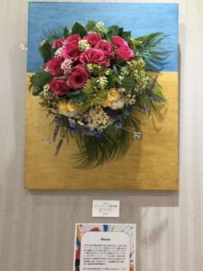 主にキャンバスに油彩を用いてベースとなる色彩をかき、その上に20年以上続けている造花アレンジの技術をあわせてブーケを制作しています。作品ごとに油彩の色使いを工夫し、造花の配置や種類も細かく調整することで、ひとつひとつ表現に個性とストーリーを大切にしています。
